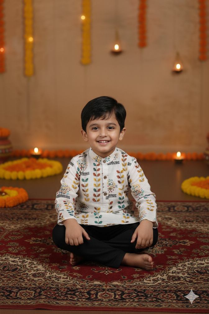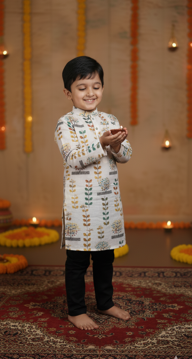 A charming off-white cotton kurta with multicolor tree and leaf print, paired with classic black pajama. Designed with a mandarin collar and wooden buttons, this set blends festive elegance with all-day comfort—perfect for traditional occasions and celebrations.