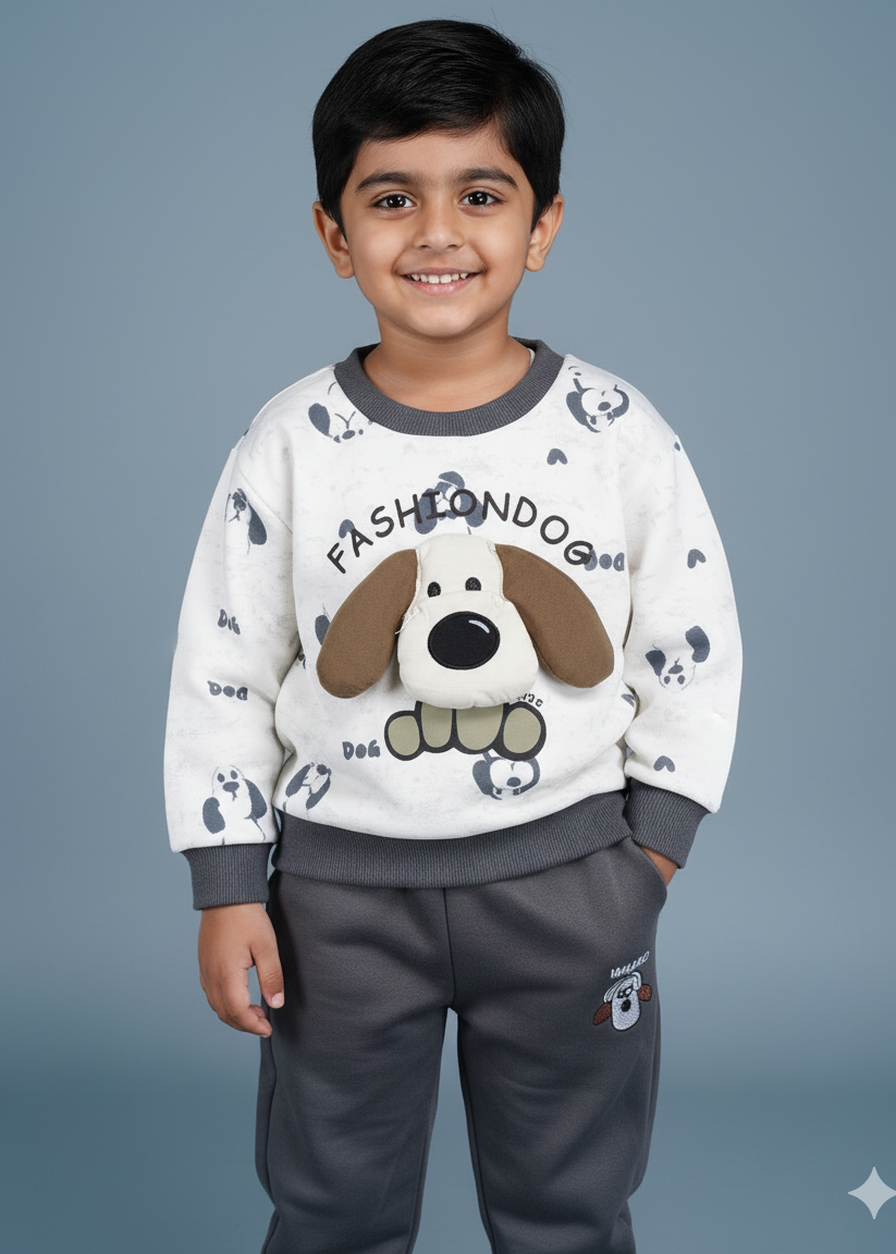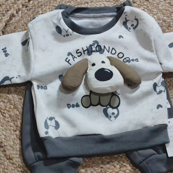 A comfy and casual pre-winter/Winter co-ord set featuring a round-neck sweatshirt with a fun Puppy 3D graphic print and matching solid jogger pants. The light-weight, cozy fabric is perfect for layering, offering a blend of warmth and flexibility for your little adventurer's everyday play.