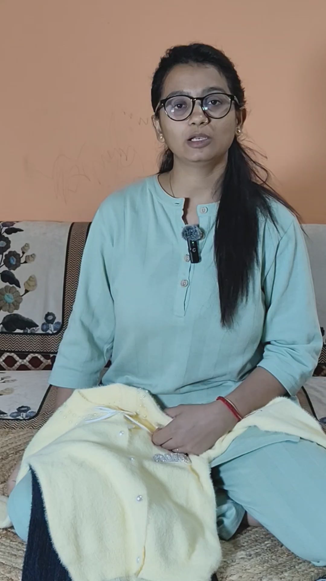 A charming and cozy outfit featuring a soft, yellow cardigan embellished with pearl-like buttons and a white satin bow detail at the neck. The cardigan is paired with black, fluffy, textured flared pants, creating a warm yet elegant look for a young child.